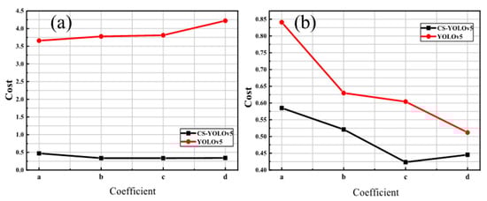 The experimental results of classification cost of four groups (a)–(d) with different risk coefficients are shown in Figure 5. For the four groups (a), (b), (c), and (d), the classification costs related to CS-YOLOv5 are 0.000470, 0.000337, 0.000340, and 0.000341, while those for YOLOv5 are 0.00368, 0.00378, 0.00381, and 0.00422. Compared with YOLOv5, the cost of group (a) for CS-YOLOv5 decreases by 87.16%, and the most significant decrease in group (d) is 91.93%. This is because the risk coefficient ratio of different groups directly affects the cost matrix, thus giving CS-YOLOv5 different cost sensitivities during training. According to the cost metric given by Equation (17), different risk matrices also make models have different cost performances. Similar conclusions can be obtained in Figure 5b. According to the results of the NEU and Paint datasets, the classification cost of the cost-sensitive YOLOv5 model is also significantly lower than that of the original YOLOv5. Under different risk coefficients, the output of the cost-sensitive YOLOv5 model itself has lower classification costs, which proves the effectiveness of our method.