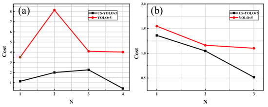 As can be seen from Figure 6, when the number of positive classes in the NEU surface defect database dataset is 1, 2, 3, and 4, the classification cost of CS-YOLOv5 is 67.58%, 75.36%, 44.56%, and 89.27% lower than that of YOLOv5. Different numbers of positive classes will affect the construction of the cost matrix, so the parameters of CS-YOLOv5 have different cost sensitivity. According to the cost metric defined by Formula (17), the change in the cost matrix will lead to different classification cost of YOLOv5. Similarly, the analysis of Figure 6b can also reach a similar conclusion. Therefore, the classification cost of the CS-YOLOv5 model is lower than the original model under various partitions on both datasets, which demonstrates the superiority of the direct-type cost-sensitive method. In addition, the performance under mAP and F1-score is shown in Table 3.