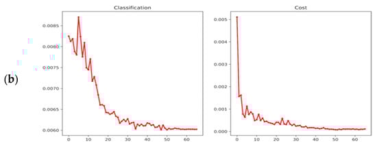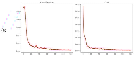 Moreover, since the number of images in these two datasets is not large (1800 and 1417, respectively) and the categories are fewer than 10, many epochs are not necessary. We present the training classification loss and cost curves in Figure 8, and we can observe that the models tend to converge under the adopted settings.