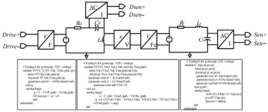 The equivalent electrical model of the MEMS gyroscope’s sensitive structure is realized by the combination of resistance and tolerance components and Verilog-A module. The electrostatic driving force (Fd) of the driving loop makes the MEMS gyroscope’s central proof mass oscillate in stable amplitude along the driving direction. The amount of charge on the capacitor (Qd) represents the displacement in the driving direction, which is converted into velocity and multiplied by the Coriolis force coefficient to obtain the Coriolis force (Fc) in the sense direction. The Coriolis force causes the gyroscope’s sensitive structure to produce a certain displacement of sense direction, and the amount of charge on Cs reflects the displacement, so that the external input angular velocity (Ω) can be calculated.