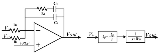 The PI controller compares the driving displacement amplitude obtained after low-pass filtering with the reference voltage, and outputs the voltage signal to the voltage-controlled nonlinear multiplier gain. Adjust the driving displacement amplitude to realize the voltage-controlled gain function of the AGC module. Figure 12 shows the highly integrated PI controller designed. According to the PI controller circuit structure, its transfer function can be obtained by Equation (21).