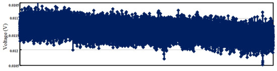Figure 21 shows the test diagram of driving voltage signal of the MEMS gyroscope. It can be found that after the ASIC is powered on, the whole MEMS gyroscope system can vibrate quickly and achieve stable simple harmonic vibration, and the resonant frequency of the gyroscope driving circuit is 54.76 kHz. Both the driving detection signal and the driving feedback signal oscillate in constant amplitude at the gyroscope resonant frequency. At the room temperature of 25 °C, use a multimeter to measure the AC amplitude of the driving voltage signal at five points per second. The result after one hour is collected, as shown in Figure 21. After calculation, the average RMS value of driving detection signal is 0.387 V. The maximum value of driving voltage signal amplitude is 0.389 V and the minimum value is 0.389 V. By averaging every 50 points of the obtained test data, the variance of driving the amplitude fluctuation of the detection signal can be calculated as 2.47 × 10−5 V. The results show that the driving displacement amplitude of the MEMS gyroscope has good stability.