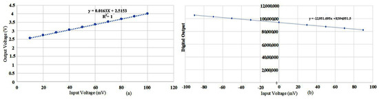 Scale factor is the most important performance parameter of the MEMS gyroscope, reflecting the linearity of the gyroscope output. In order to simulate the actual angular velocity input of the actual gyroscope, an AC signal with the same frequency as the resonant frequency is applied to the sense circuit of the MEMS gyroscope interface circuit. Figure 23 shows the linear fitting curve between the output signal and input voltage of the MEMS gyroscope test circuit. It can be obtained that the nonlinearity of the output angular velocity detected by the MEMS gyroscope is 0.03%.