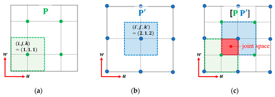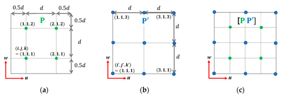 Two different grid sets and corresponding pairwise grid set projected on the u–w plane. (a) Distribution of the first grid set P; (i, j, k) represent the directional index of the first grid set for each u, v, and w-axis, respectively. (b) Distribution of the second grid set P’; (i’, j’, k’) represent the directional index of the second grid set for each u, v, and w-axis, respectively. (c) Pairwise grid set [P P’] in the search space comprising the first and second grid set.