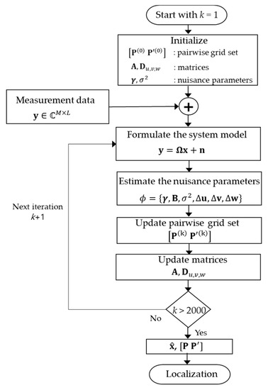 The stochastic model based on BSBL [32,33] provides us with an efficient way to estimate the nuisance parameter , which is required for obtaining the solution . After the estimation process, we can obtain the nuisance parameter () and solution , providing the positions and amplitude of TVCs, as described in [11]. Here, the derivation of the stochastic model for the pairwise off-grid system is presented.