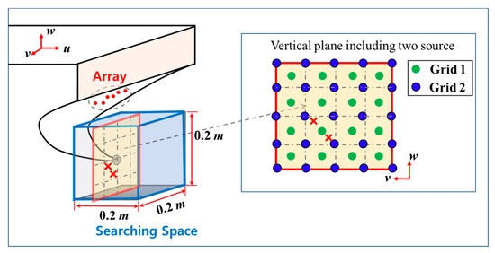 Numerical tests were examined to validate the localization performance. Figure 5 shows the numerical environment for the localization process which involves the two adjacent monopole sources emitting the spherical waves. We set the search space (𝑢-axis: −0.05 to 0.15 m; 𝑣-axis: −0.10 to 0.10 m; 𝑤-axis: −0.03 to 0.17 m) and allocate the simulated sources, having the same amplitude at vertical plane 𝑢 = 0.00 m: (0, 0.03, 0.01) m, (0, 0.06, 0.04) m. For the localization, 13 frequency components ([20:5:80] kHz) are measured using the 6 hydrophones (L = 13 and M = 6) and 1 s long time signals are recorded with a sampling frequency of 256 kHz. The signal-to-noise ratio (SNR) in the tests was set to 20 dB, which was sufficient to discriminate the sources from noise. We used grid intervals varying with d = 0.025, 0.05, and 0.10 m for each localization process, then examined the resolution and computational burden of the localization process along with various beamformers.
