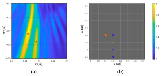 Figure 9b shows the localization results for the experiment, which are projected onto the 𝑢–𝑤 (looking from the portside) and 𝑣–𝑤 (looking from the stern side) planes for visualization. By using the pairwise off-grid BSBL, a single dominant component (colored square at ) is observed, which is very close to the actual position (marked with ‘x’).
