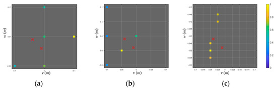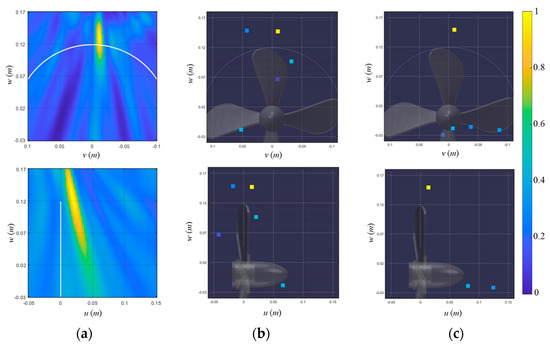 Figure 11 and Figure 12 display the localization results of signals 1 and 2 for the conventional beamformer, the off-grid BSBL, and the pairwise off-grid BSBL. The conventional beamformer estimated the TVC location with the ambiguity surface on the v–w and u–w planes, which had a maximum value of 1 (Figure 11a and Figure 12a). One dominant ellipse appeared near the top of the propeller, indicating the presence of one pop-type cavitation; however, the conventional beamformer still suffered from poor resolution along the vertical axis. On the other hand, the off-grid-based methods display the five largest components, which were projected onto the u–w and u–w planes and provide one dominant component representing the pop-type cavitation noise (Figure 11b,c and Figure 12b,c). For the measurement, including single pop-type cavitation, off-grid BSBLs eliminate ambiguity in the conventional beamformer and provide a distinct source position.