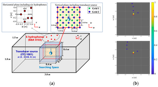 Transducer data was applied to 3D pairwise off-grid BSBL in this section. Figure 9a illustrates the configuration of the transducer experiment conducted in the cavitation tunnel. One transducer source (ITC-1001) with a known position ( m) was emitting the broadband spherical waves over the frequencies from 7 kHz to 37 kHz, and corresponding acoustic data was measured on six hydrophones (B&K 8103) mounted at the top of the cavitation tunnel. For the localization, 16 frequency components (, [7:2:37] kHz) were obtained from the 1 s long acoustic signal using the fast Fourier transform (FFT), and 189 grid points ( at intervals of 0.10 m are exploited to set the search space (𝑢-axis: −0.20 to 0.20 m; 𝑣-axis: −0.60 to −0.20 m; 𝑤-axis: −0.20 to 0.20 m).