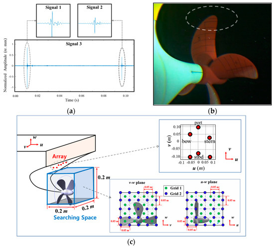 Figure 10a shows a 0.1 s long signal (signal 3), including two impulse-type cavitations (signals 1 and 2) with a sampling frequency of 256 kHz, measured on the six hydrophones, as shown in Figure 10c. This short sustained and intermittent cavitation is categorized as pop-type cavitation and mostly occurs near the upper part of the propeller in the incipient stage (Figure 10b) [3,5]. From the signal, we extracted three snapshots (signals 1–3, as shown in Figure 10a) to generate the multiple measurement vector. Signals 1 and 2 have 2048 data points, including each pop-type cavitation. Meanwhile, signal 3 has 26,214 data points, including both pop-type cavitations (for the detailed experimental setup and the raw acoustic data, readers are referred to Appendix B). For the localization, zero padding was conducted to increase the resolution, and 13 frequency components ([20:5:80] kHz) were sampled to generate multiple measurements. The search space (𝑢-axis: −0.05 to 0.15 m; 𝑣-axis: −0.10 to 0.10 m; 𝑤-axis: −0.03 to 0.17 m) comprises the grid points with the grid interval 0.05 m for the localizations using BSBLs.