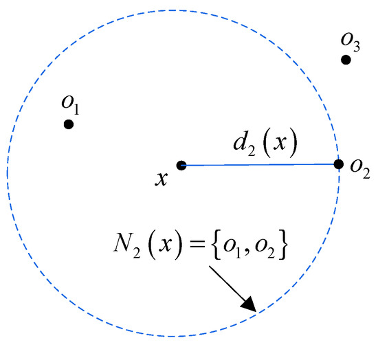 The k-distance neighborhood of x represents a set, denoted as , and all points o in the set are no more than away from x. Figure 1 visually explains k-distance and its neighborhood.