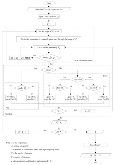 The proposed method is divided into two main parts: local outlier correction and the AOHHO algorithm. The AOHHO algorithm is used to obtain the optimal threshold . The local outlier is then detected using the threshold . Next, the outliers are corrected to obtain the temperature-induced response with noise. Finally, the temperature-induced response can be obtained using S-G smoothing to filter out the noise in . Figure 5 depicts the flow chart for the proposed method.