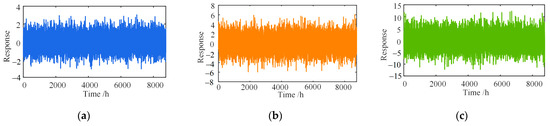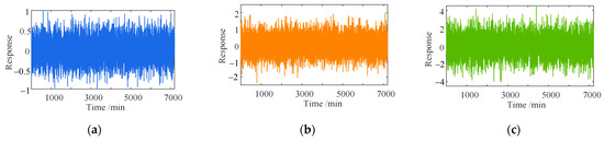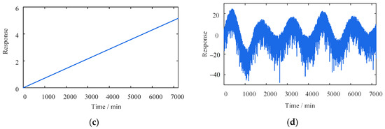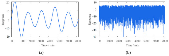 where and represent the seasonal and daily temperature-induced responses, respectively; is a constant equal to 60; is a random value inside (7, 20); is the frequency; is a fixed value of 10; , a one-dimensional array, represents a normal distribution with a mean of 0.