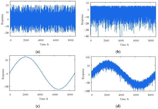 Different types of simulated signals (one year). (a) Daily temperature-induced response; (b) traffic-induced response; (c) seasonal temperature-induced response; (d) mixed signals.