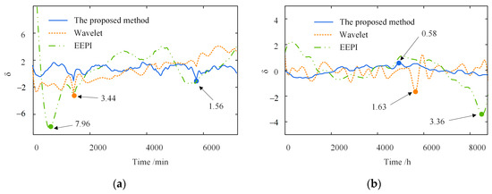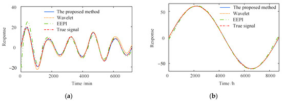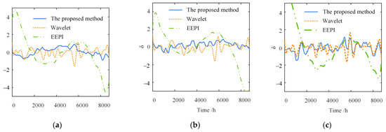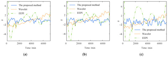 Figure 10 shows the separation error in the different time windows. In contrast to the other two methods, the proposed method has a much smaller separation error on the different time scales. The shorter the time window, the greater the superiority of the proposed method. Furthermore, as shown in Figure 10a, the maximum of the wavelet-based method is 3.44, about 2.2 times that of the proposed method. The maximum of the EEPI-based method is 7.96, without considering the error caused by the “end effect”, about 5.1 times that of the proposed method. Simultaneously, the separation error within five days is more extensive than one year, indicating that the accuracy of the three separate approaches depends on the time window length. The more extensive the time range, the greater the separation accuracy of the three methods.