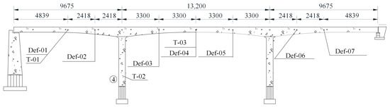 The bridge is equipped with temperature sensors and vertical deflection sensors, and the frequency of the sensors is 1/600 Hz and 1 Hz, respectively. The sensor layout on the bridge is shown in Figure 15 and Figure 16.