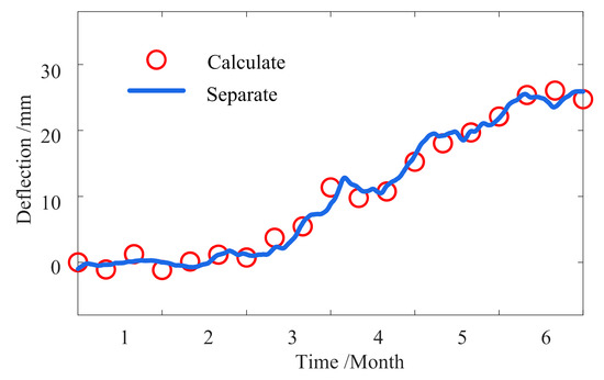 To explore the specific correlation, it is required to separate the temperature-induced response from the measured deflection. An FEM is established for the bridge by a space beam element in MIDAS, and each element is 1.5 m long. The bridge structural deflection is calculated using the maximum temperature difference every ten days as the system temperature input to MIDAS. The calculation deflection and the separation response are shown in Figure 18.