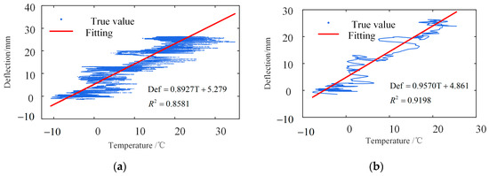 Figure 18 shows that their trends and amplitudes are the same, which further verifies the rationality and reliability of the separation method. The separated deflection changes significantly within half a year, up to 30 mm, indicating that the temperature intensely affects the structure. The correlation coefficient is 0.8581 by a regression analysis of the measured temperature and deflection data. The fitting line and the measured values are shown in Figure 19a.
