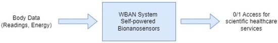 A realistic application for this system model would be the healthcare service allocation for patients by healthcare providers in a region which is equipped with a 4G/5G tower. Using data gathered from people with a WBAN and by defining a set of thresholds based on the predetermined specifications of the 4G/5G tower’s hardware as well as pre-simulated samples, mathematical and machine learning-based analysis can be implemented on the data of the region, thereby producing insights on healthcare service provisioning in the region. Therefore, according to the design problem described in Figure 1, the system is concerned with performing a mathematical analysis taking into consideration the predetermined thresholds, as previously mentioned. This system collects the body information and then produces a permission concerning whether to grant (1) an access or not (0) for each patient.