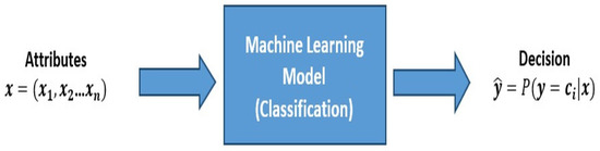 To model the implemented ML at the collector, mathematical analysis is implemented by utilizing machine learning algorithms for supervised classification. The collector depends on a training set of the acceptable and unacceptable operating ranges of the various implemented sensors. The collector reaches a suitable decision to either continue receiving readings from a sensor, to skip readings from that sensor or to allow sensors to operate with limited active time. Several classification algorithms are used, including decision trees, support vector machines, and neural networks. These algorithms can be used to test the possibility of enabling effective multiple health monitoring services. The machine learning models take in the collected preprocessed sensor-related data, which is classified into the most pivotal attributes according to the health monitoring service, and then it produces the decision on providing the monitoring services or not. Figure 3 shows a simple explanation for the machine learning model. Multiple attributes x, such as generated voltage level and sensor priority and location, are fed to the ML models, which were trained to reach decisions on providing a health monitoring service with or without restrictions or stopping service provision. We assume three classes () where refers to continue working without restrictions (no changes on the active time), refers to continue working with restrictions (a change in the active time to be less), and refers to stop working.