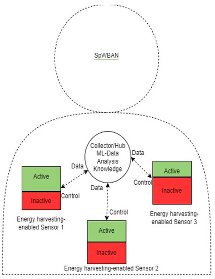 The collector or hop employs a lightweight machine learning (ML) algorithm and performs some analytics to reach a decision whether to continue accepting readings from a sensor or a suite of sensors or to direct them to minimize the active time or to stop sending readings. The collector will receive feedback from sensors about the generated level of harvested energy or voltage and other parameters, such as sensor location and monitored biometric priority. There are three sensor types, which are heart sensor, arm sensor, and knee sensor. There are also three levels of sensor priority, which are high, medium, and low. For example, if the collector receives data from a sensor referring to a low level of generated voltage and that sensor is monitoring a low-priority biometric, then, based on the employed ML algorithm, the collector makes a decision about continuing to receive readings from the sensor or applying some restrictions. If there is a very low level of generated voltage (leading to high energy consumption), the collector directs the sensor to stop activity until an acceptable level of the generated voltage is reached based on the operating requirements of the sensors.