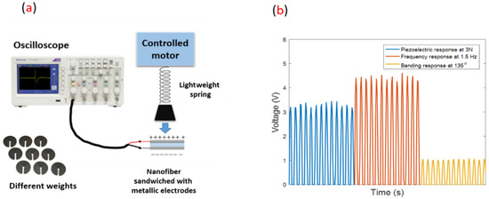 The proposed nano-biosensors consist of electrospun PVDF nanofibers mats fabricated as follows. First, 10 wt.% of PVDF (Kynar®, King of Prussia, PA, USA) polymer was dissolved in Dimethylformamide (DMF 98%, Sigma Aldrich, Taufkirchen, Germany) at room-temperature overnight with stirring. In the electrospinning process, the dissolved polymer was fed through a needle with a constant feed rate of 1 mL/h and applied to an electric high voltage power supply (Spellman, Hauppauge, NY, USA) up to 25 kV and then deposited on an electrically-grounded collector drum. The generated nanofibers mats were analyzed through a simple piezoelectric setup, as shown in Figure 6, where the output voltage was measured using a Tektronix MDO3014 oscilloscope under different applied mechanical vibrations.