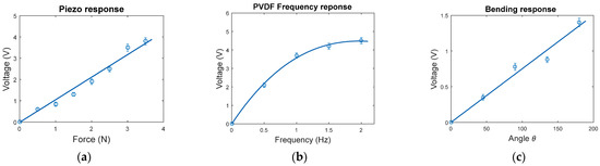 The piezoelectric characterizations, including the piezoelectric, frequency, and bending responses, that are discussed in this section are shown in Figure 7. For the piezoelectric response, the output voltage increases linearly as long as the force increases at 1 Hz frequency, as shown in Figure 7a. When the force fixed at 3.5 N and the frequency is tuned, the output voltage increases and is saturated at 2 Hz with a voltage amplitude of 4.2 V, as shown in Figure 7b. The bending response in Figure 7c shows that the output voltage increases linearly as the angle increases.
