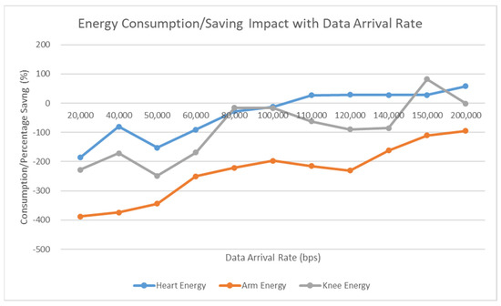 We analyzed the energy consumption of SpWBAN versus the data arrival rate and the potential energy consumption and savings in the network. Figure 8 shows that operating SpWBAN with self-powering sensor nodes can optimize the energy consumption. Increasing the data arrival rates results in more energy consumption; however, with the self-powering sensors, the energy consumption effect is relieved. When varying the data arrival rates, the network is capable of saving a notable amount of energy that can support a sustainable long-term operation of the network. We compared the amount of energy consumed in case of running different sensors to support multiple levels of data rates. We found that the sensor mounted at the elbow generates much energy compared with the sensors mounted at the heart and knee. Accordingly, depending on the simulated scenario, the elbow sensor achieves average energy savings of 61% and 85% with respect to the sensors at the knee and heart, respectively.