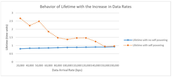 For the network lifetime, the sensors nodes are equipped with self-powering piezoelectric materials. Based on the expected movements, the generated energy and the consumed energy per sensor node, Figure 9 shows the improvement that can occur in the network lifetime when using the self-powered sensor nodes. The figure also provides the ratio of lifetime prolongation with respect to the data arrival rate. As expected, the lifetime of the network is affected negatively with increasing data arrival rates. However, adopting self-powering sensors leads to an increase in the lifetime of SpWBAN by 47% on average, depending on the operating data arrival rate.