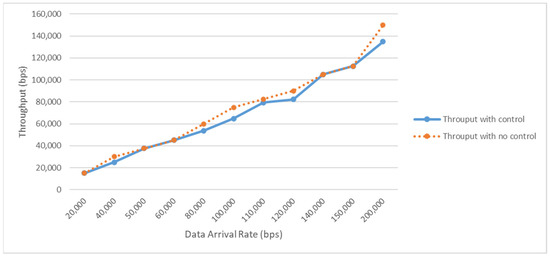Figure 10 shows the effect of having self-powering sensor nodes in SpWBAN and the ability of the sensors to be active most of the frame duration by adopting the single-beam transmission mode. We assume that during most of the frame duration, the sensor nodes can send data; however, if the harvested energy of each sensor does not meet the required operating level, the time allocated to each sensor node cannot exceed 75% of the frame duration. As can be observed in the figure, the applied machine learning management of control sensor operations and data sending results in good levels of network throughput when controlling the allocated time for sensors to send. Moreover, adjusting the activation time that the sensors send data has a significant impact on energy saving in the network, and hence the lifetime.