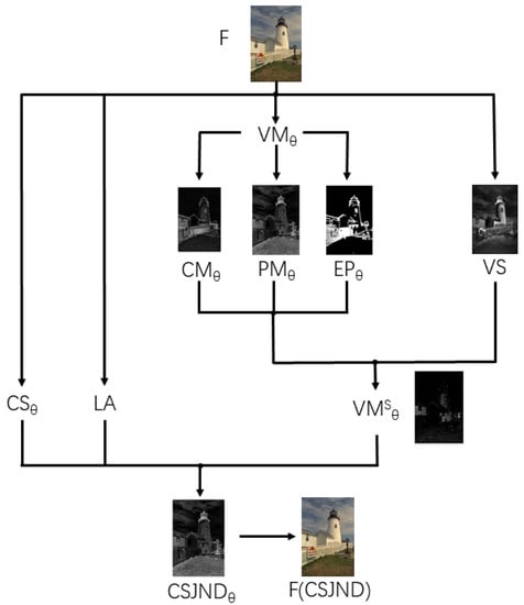 Research has shown that the visibility of the HVS is limited for all visual signals. The human eyes can only notice changes beyond a certain threshold of visibility, and this threshold is called the just noticeable difference (JND) [,]. By simulating the perceptual properties of the HVS, the JND model was developed to estimate the visibility threshold of human eyes. When the change in pixel value is below this threshold, this change is not perceived by human eyes. Therefore, an appropriate JND model can accurately estimate the visibility threshold of the HVS and is frequently applied to image/video processing, such as in information concealing and watermarking [,,], perceptual image/video coding [,], and perceptual quality assessment [,,].