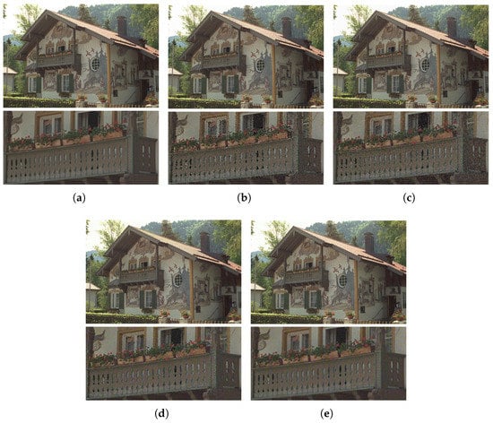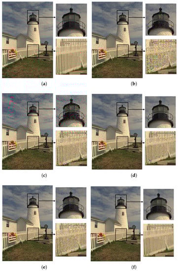 With the help of Equation (20), the image was contaminated under the guidance of JND models based on the different factors, including , , , and . The comparison of contaminated images from JND models based on the different proposed factors is shown in Figure 4. The contaminated images (size 768 × 512) had the same level of noise, with PSNR = 28.25 dB. However, their perceptual quality was significantly different.
