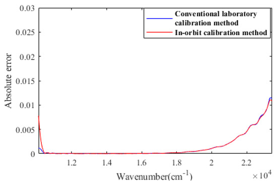 The array of analytical values varying with the simulated illuminant is shown in Figure 3. In different cases, the analytical trend of is highly consistent with the calculation results based on the theoretical model. Furthermore, we reached some interesting conclusions: (a) The DOP is not coupled with other parameters as shown in Figure 3e. The error of the analytic DOP is not a factor affecting the analytical characteristics of ; (b) Compared with Figure 3c,d, the maximum of in Figure 3a,b are too “dense” to be distinguished, which corresponds to being considered as only caused by the alignment error. It proves that tiny will directly impact the sensitivity and effectiveness of the TMF. It is necessary to consider making the angular difference between the actual setting position and the preset position of high-order retarders easier to distinguish. We compare the simulated in-orbit calibration method of with the conventional laboratory calibration method at . Figure 4 compares calibration errors at 10,500–23,450 nm−1.