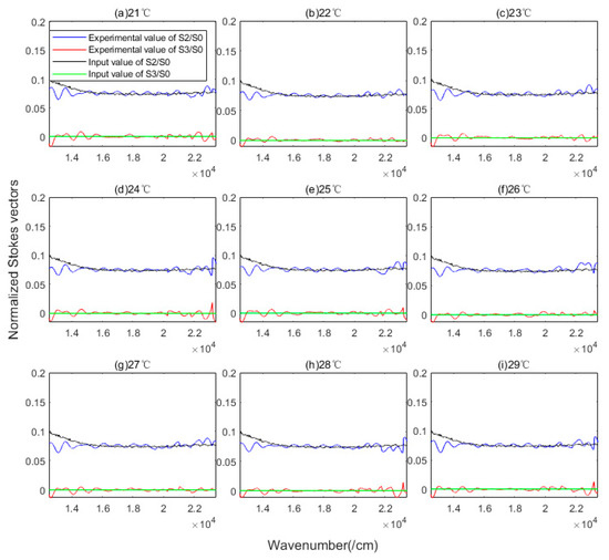 In the multi-parameter coupling calibration scheme, it is not easy to highlight the influence of a single parameter. Therefore, we take the reconstruction accuracy of the Stokes vector as the traceability benchmark. The is coupled to the reconstruction model of S2 and S3. Figure 7 compares the normalized reconstructed Stokes vector with the input value corresponding to different temperature settings. The reconstruction accuracy of S2 and S3 in the whole wavenumber domain by RMSE is 7.2 × 10−3 and 3.3 × 10−3.