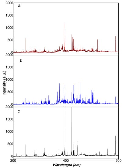 In view of an efficient discrimination of materials by LIBS, the different emissions, including elemental and molecular information, may be combined. This complex spectral information and the need to make it clear has led to a rich chemometric literature. As for most infra-red or Raman studies, this combination has been used for the discrimination of different types of samples, such as polymers employed in toys, common polymers, or pigments, using Principal Component Analysis (PCA), K nearest neighbors (KNN), Soft Independent Modeling of Class Analogy (SIMCA), and Partial Least Square for discriminant analysis, PLS-DA [23,24,25]. The LIBS fingerprint has also been applied to very similar sample such as meats or hair. In the case of meat, an adulteration of meat using offal could be identified using selected line measurements on the LIBS spectra and further PCA analysis [5]. If the elemental fingerprint is typical of the sample nature, a lack or a deficiency in the main element compared with the average level may reflect a problem. From this assumption, the concentration of elements in nails has been employed to distinguish between healthy and alcoholic or opium addicted patients [26]. In several cases, the major element concentrations are affected by the addiction or illness [27]. Chemometrics are also employed for calibration purpose; PLS and even PCR models are shown to provide robustness and precision for metal determination in polymers; RF (random forest) with spectra calibration is also efficient for multielement calibration [28,29]. To examine the data, an unsupervised method is frequently employed in order to reduce the data obtained either from the complete spectra (i.e., more than 20,000 pts for each spectra) or from a selected list of measured wavelengths that represent a limited number of elements (10 to more than 50) [5,9]. In the case of complete spectra, the score plots often represent the model spectra that allows to discriminate samples. When naturally occurring classes exist, most studies use supervised tools such as discriminant function analysis (DFA), which further allows to determine which variables discriminate between the known naturally occurring groups [26]. Once the model is well validated, prediction is employed for unknown samples. Such operations are performed using KNN, Soft Independent Modeling of Class Analogy, SIMCA, or PLS-DA [30]. One of the key feature of LIBS measurements is the combined molecular and elemental data obtained from the same spectrum. The advantage over other elemental analysis methods is that it allows, when combined, a multivariate analysis to discriminate between very similar samples such as polymers, synthetics, and genuine leather [7,24].