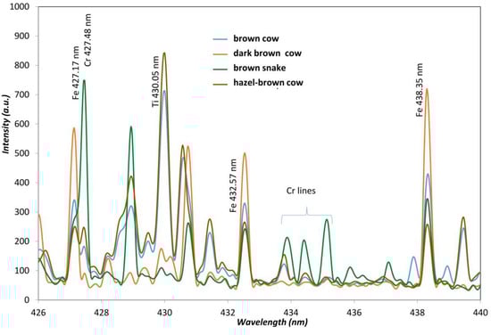 The leather treatment from chromium or titanium produces very intense lines due to the over-percent concentration of the element contrasting with the low intensity spectra of other leather (Figure 1). As seen from Figure 1 and Figure 2, the spectral fingerprint of the titanium tanning process produces a complex spectrum. From our sample set, many different animal skins were found to be titanium tanned (38%), while chromium tanning was 40% on a total data set of 56 leather samples. Vegetable tanning represents 20% of our sample set. Some leather contained both chromium and titanium, probably due to the color pigments employed. Leather spectral fingerprints (Figure 1) are also characterized by the unhearing protocol; animal skin is treated with chemical agents such as sodium hydroxide and calcium hydrosulfide. Alkalinity removal requires acids. Nevertheless, the ions from alkalis remain, and strong signals of both Na and Ca appear on all the leather spectra. The further tanning process requires solutions with high concentrations of tanning agents, metal sulfates, such as Cr, Al, and Ti, and vegetable tannins. As can be seen from Figure 1, if Ti and Cr tanning are producing high intensities for the specific lines of both elements, when no Ti or Cr is employed, the signals from Na and Ca are even more intense. In finishing operations, pigments, solvents, oils, colorants, and coating products are added to give shine and softness to the leather. Furthermore, the animal skin itself brings elemental characteristics of the animal. It can be observed that leather from fish origin (stingray) contains a very high amount of phosphorus, as seen from the occurrence of 213.62 nm and 214.92 nm phosphorus lines. Elements from pigment dyes are also relatively intense, such as iron or copper, as most of the brown colored leathers are tinted using iron oxides. The iron level is different from light brown or “gold” color to dark brown; as seen from spectra in Figure 2, the Fe 438.38 nm line intensity increases as the color gets darker.