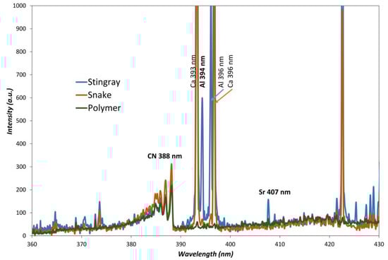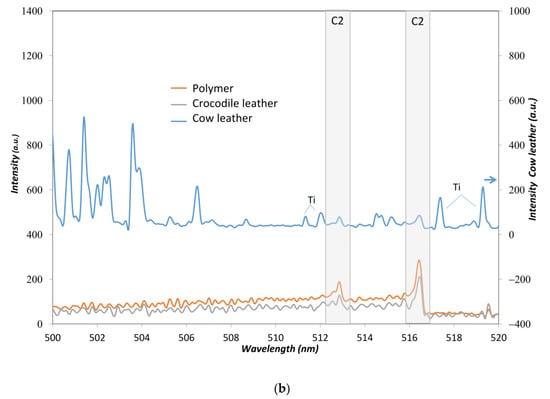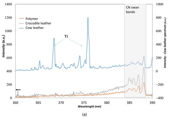 An examination of the molecular signatures (Figure 5) shows that the molecular signals on the LIBS spectra are very limited for some leathers. It is observed that the organic fingerprint provided by the CN and C2 bands is limited on the titanium-tanned leather, as seen from spectra of the cow leather treated with titanium (blue spectra from Figure 5a,b). The C2 bands from many leathers appeared very low whereas, the CN band could be distinguished. These typical molecular signatures appeared clearly on crocodile leather and polymers. The polymers all exhibited intense C2 molecular bands, and when CN is present in the material, the CN bands are also clearly distinguished. Their spectra is most of the time dominated by these strong signals. When the leather are examined, their surface treatment, performed either to obtain an aniline or semi-aniline finish, may contain chemicals likely to increase the intensity of both C2 and CN. Depending on the treatment, the polymeric character is reinforced or not.