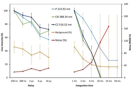 Delay and integration time optimization on the handheld LIBS. Lines and background intensity are normalized to the first measure. Uncertainty is calculated using the five grid replicates on the sample surface.