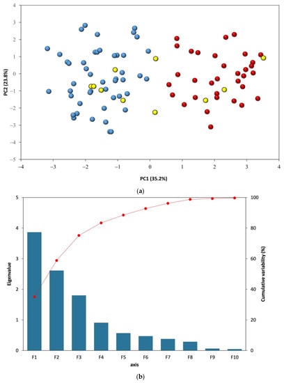 (a) PCA realized from the 10 molecular and organic element measurements (blue circles: leather, red circles: polymers, and yellow circles: synthetic leather). (b) Scree plot from the PCA shown in (a).