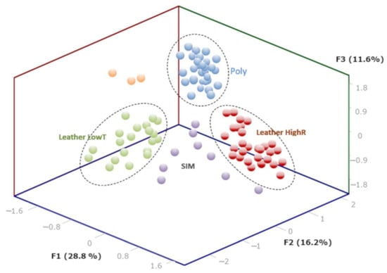 The 3D representation of the factor analysis is shown in Figure 7. Cluster analysis shows that the leathers are well separated in two distinct groups (LowT and HighR). The polymers (POLY) are also discriminated from the first two groups and from the synthetic-leather (SIM) samples that appear dispersed between the clusters. The most important group is POLY; the polymers are very similar in comparison with leathers so that the 34 samples appeared as a very compact cluster. Three leather samples appeared also as outliers (orange balls) with distinct values for the first three factors. The three leathers contained both Cr and Ti together with a dark brown color so that they could belong to the two leather groups.