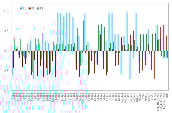 A principal component factor analysis (using a Varimax rotation to determine the factor loadings) was exploited to determine the common features responsible for the correlation structure among the variables: elemental (lines) and molecular information. Factor analysis allows to identify a hidden variable, assuming that correlation between measured variables can be explained by this common factor. Taking into account the 50 lines for each leather or polymer, the factor analysis was performed and is presented in Figure 7.