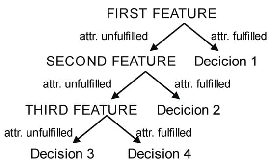 A decision tree (DT) is a commonly used machine learning method for decision support in data analysis and statistics, with a particular focus on artificial data mining. The goal of DTs is to create a model that predicts the target value based on multiple inputs. Decision Tree methods, therefore, are a widely used model for solving classification and regression problems in the context of supervised learning. The structure of DTs is depicted by branches and leaves, where branches contain the attributes that the function relies on, and leaves contain the function’s value. Other nodes contain attributes that distinguish the decision cases. An illustration of the DT algorithm is presented in Figure 4.