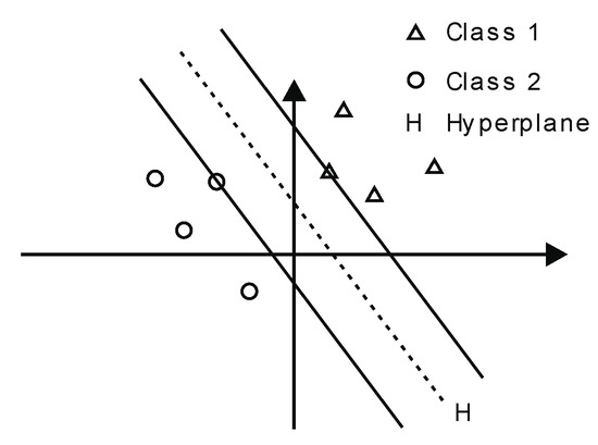 Intuitively, Support Vector Machines (SVMs) are models that map sample points into a multi-dimensional space, separating them into two distinct classes. This division is achieved by a hyperplane, as demonstrated in Figure 5. The hyperplane is determined by the two closest sample points from each class, referred to as support vectors. These support vectors determine the boundaries of the classes, with the distance between the support vectors of each class, referred to as the margin. Although there are multiple hyperplanes that can effectively classify the samples, it is common practice to select the hyperplane with the greatest margin.