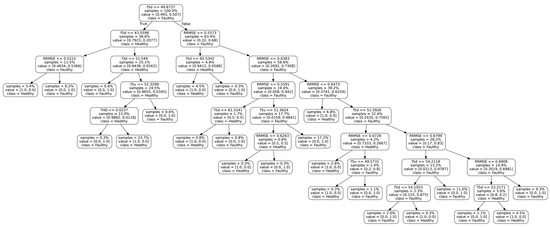 A graphical representation of the DT model with the decisions made to classify a new observation is shown in Figure 11. It is worth noting the importance that the RRMSE value takes, appearing in 9 out of the 22 decisions made by the decision tree. The theory would suggest that the presence of sidebands is the determining factor, but in this case, it is not as significant.