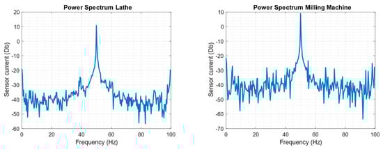 Figure 12 shows the power spectrum of the lathe and milling machine during tests with a higher load. There are no noticeable peaks in the sidebands of either machine. The windowing effect can be observed at the ends of the figures, leading to inaccurate values in these regions, as mentioned before. Those values are discarded.