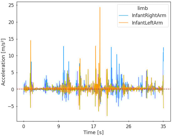 After pre-processing, the sensor data and manual coding had to be synchronized, as sensors and cameras had to be turned on separately; consequently, there was a short delay between the data. The synchronization was performed based on the isolated activity, i.e., infant’s leg kicks, and followed the procedure from Laudańska et al. [29]. First, the acceleration data from the period of 15 s before the annotation of the first leg kick and 15 s after the annotation of the last kick were displayed on the graphical interface. Next, the period of activity peaks corresponding to kicking movements was manually identified (see Figure S1 for an exemplary activity displayed on the graphical interface). This time series of isolated acceleration peaks corresponding to leg kicks annotated based on the video recording was used to synchronize the data. To this end, the diagonal cross-recurrence quantification analysis (DCRQA) (e.g., [44]) was performed to identify the delay between manually coded infant movement and categorized sensor data with a time window that fit the data best, which was less than 3 s for the majority of data (, ). Then, the sensor data and manually coded data were plotted together, and the correctness of the data alignment was manually validated (see Figure S1 in Supplementary Materials for exemplary visualization of acceleration pre- and post-synchronization). The following analyses were conducted on the temporally aligned time series. After pre-processing, 9.8 m/s2 was subtracted from the acceleration data to account for gravity. Figure 2 presents an example of acceleration generated by a participant throughout the task. The code used for sensor and manual coding data pre-processing and synchronization can be found on GitHub (https://github.com/akoziol98/Processing-Sensor-Data (accessed on 23 January 2023)).