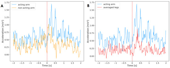 Acceleration of the acting hand with (A) the non-acting arm and (B) legs mean, averaged across all reaching movements (n = 184). The plot displays activity two seconds before and two seconds after the onset of the reaching movement (marked by a red, dashed line at time = 0). The standard deviation has not been added to the plot to improve clarity.