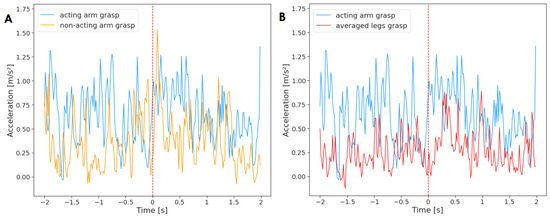 Acceleration of the acting hand with (A) the non-acting arm and (B) legs mean, averaged across reaching movements that ended with a grasp (n = 89). The plot displays activity two seconds before and two seconds after the onset of the reaching movement (marked by red, dashed line at time = 0). The standard deviation has not been added to the plot to improve clarity.
