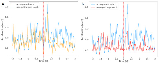 Acceleration of the acting hand with (A) the non-acting arm and (B) legs mean, averaged across reaching movements that ended with a touch (n = 61). The plot displays activity two seconds before and two seconds after the reach onset (marked by red, dashed line at time = 0). The standard deviation has not been added to the plot to improve clarity.