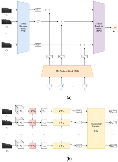 The model predicts the offset in the IMU of the drone given an input sequence of n frames with height h, width w, and a sequence of aligned IMU measurements , containing records of accelerometer and gyroscope, each along the three axes. The first issue involves synchronization, which can be achieved by exploiting the IMU and the camera timestamps. However, it is worth considering that IMUs have a much higher sampling rate with respect to cameras and that these timestamps could not be perfectly matched. To address this issue, the practical solution is to match each camera frame with the closest corresponding IMU measurement in time. This also has some side effects. On one hand, it reduces the number of inputs for the model, thereby reducing the computational demand. On the other hand, this also ensures that IMU measurements are sampled at the same rate as cameras. This is a practical advantage since it makes the system scalable with the camera quality. To handle the multi-modal nature of the task, the model entails three blocks: a video reducer block (VRB) (Section 3.1) that aims to reduce the input sequence of consecutive frames into an equally long sequence of token vectors; an IMU reducer block (IRB) (Section 3.2) that projects each IMU vector, containing records of accelerometer and gyroscope in each instant of time, into a sequence of token vectors; and a noise predictor block (NPB) (Section 3.3), which merges the information from video and IMU records and predicts the amount of offset in the latter. Figure 1 depicts the model’s architecture. The source code of the presented strategy can be found at https://github.com/rom42pla/rgb2imu_error_estimation.
